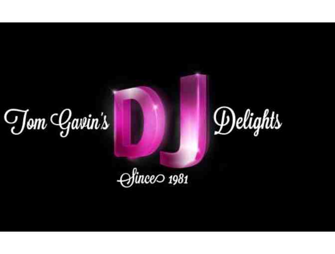 Four hours of musical entertainment by one of Tom Gavin's DJ Delights' professional disc jockeys. Since 1981, Tom Gavin and his team have been the preferred disc jockey service for thousands of weddings, parties, and celebrations. They are proud of their outstanding reputation and passion for event quality, affordability, and professionalism. Customize your music selections on their interactive website and let Tom Gavin's DJ Delights create a successful party.