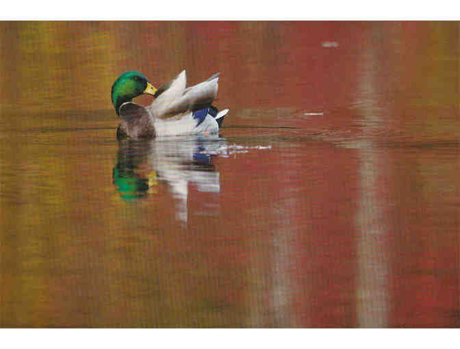 "Preening Mallard" is a photograph of a male mallard, from The Walden Pond Collection of National Geographic photographer Tim Laman. A dye-sublimation process is used to infuse the photograph onto recycled aluminum. The 12 x 8 inch aluminum is fused to ¼” black sintra and mounted to an aluminum float backing which has a lip for easy wall hanging. Tim Laman's signature appears on the label on the back. Perhaps you've seen this image with others in the series, hanging on the wall in the Shop at Walden Pond. A stunning and colorful photograph taken right at Walden Pond in Concord, Massachusetts.