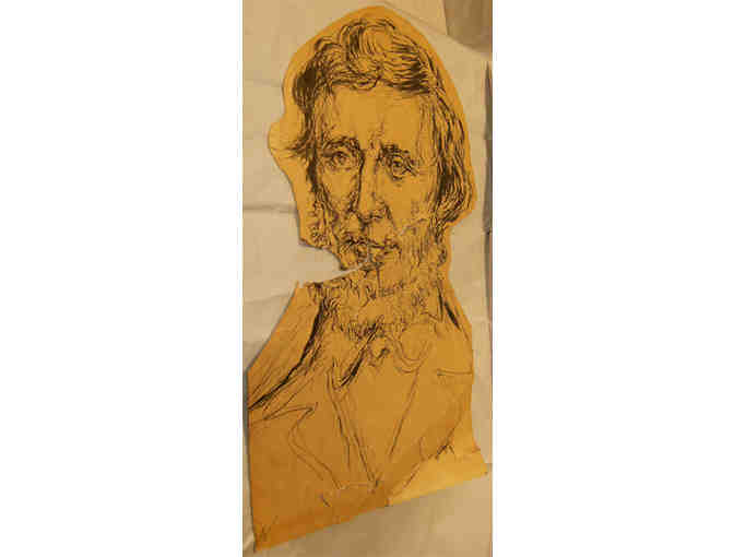 An original drawing of Henry David Thoreau, created by someone named Hayes, based on the signature. Collected by a Thoreauvian who is no longer around to tell us where he got it and who Hayes was. Measures about 19 x 12 inches. This artwork on old card stock is not in good shape and is in multiple pieces. Someone savvy could fit them together and make a mostly-good whole image. Will that someone be you?