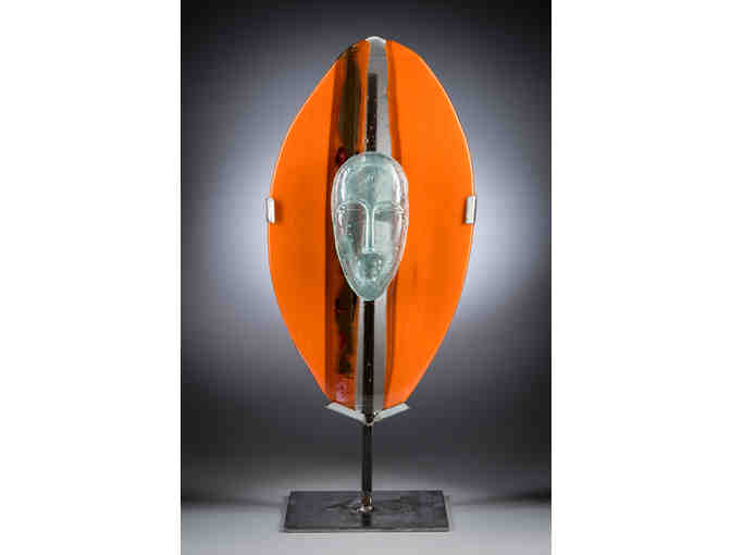 Mr. Henderson uses glass as his medium because of its translucency and reflective qualities when exposed to light and he focuses on shape, form, texture, and color. This piece depicts an Ibo Shield with African Mask and is made of fused and cast glass. The artist states: "My aesthetic philosophy is an exploration and extension of my cultural identity. I use many different materials mixed with glass, yet glass is the dominant focus in all its various applications and techniques. In creating this visual transparency --abstracting images, symbols and text-- my work invokes a spiritual awareness and connection to the past. I am reclaiming and reconciling the past with the present in order to move forward."