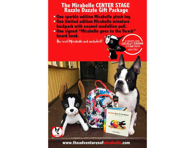 Meet Mirabelle, an inquisitive little dog who enjoys the pleasure and excitement of discovering simple things. This "Razzle Dazzle Gift Package" includes a plush toy, a limited edition miniature Mirabelle backpack with enamel charm pull, and a signed board book, Mirabelle Goes to the Beach. Too bad that sweet Mirabelle isn't included, but you can enjoy her adventures over and over through her fun stories.