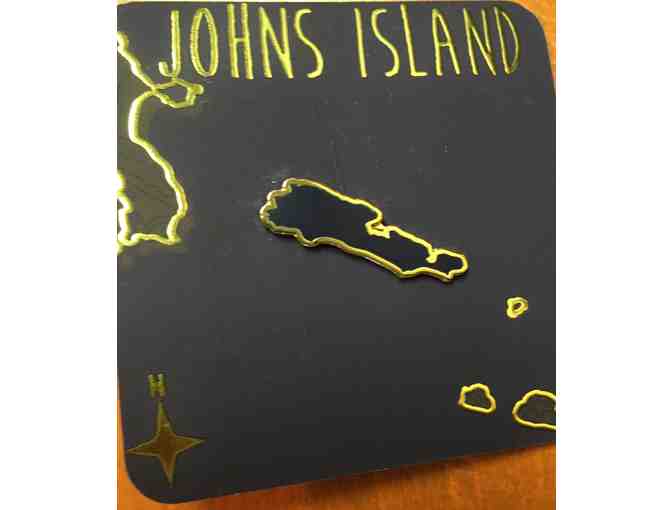 Limited edition gold and enamel pin in the shape of Johns Island. Made by Arlen Pringle, Johns Island resident and brother of former Nor'wester staff member Lily Doyle.
