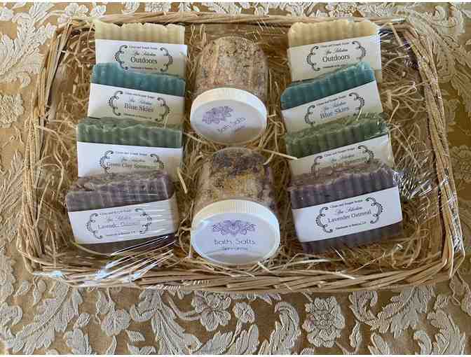 8 bars of handmade soap (fragrances: 2 Lavender Oatmeal, 2 Birchwood Oud, 2 Clover and Aloe, and 2 Spearmint Eucalyptus) and 2 jars of Soothing Bath Salts.
