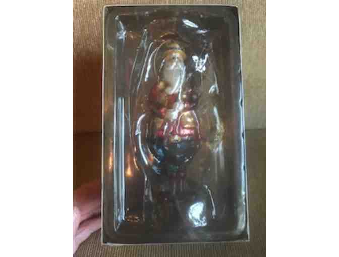 6" tall glass handpainted christmas ornament with Santa fishing. Still in original box.