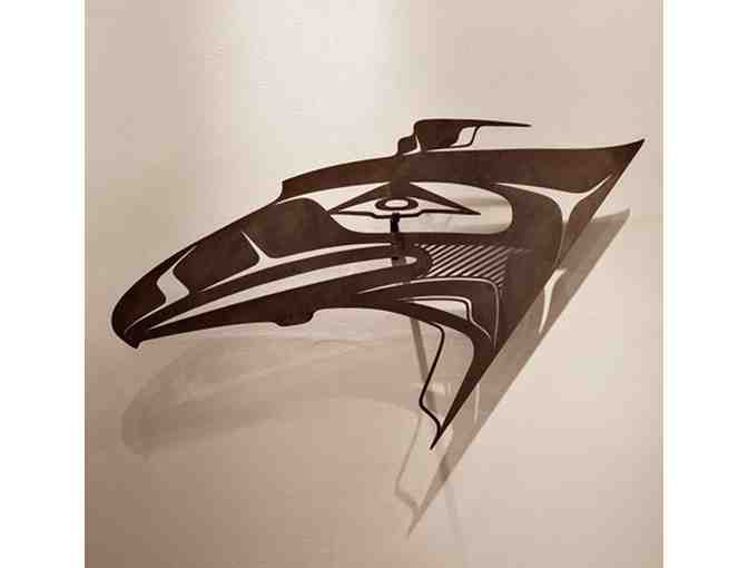 Raven Portrait, 3/16 inch thick cor-ten steel for outdoors or in (it has a dark natural rust finish that will not degrade further). Width 38 inches, 22-inch high; approximately 20 lb.