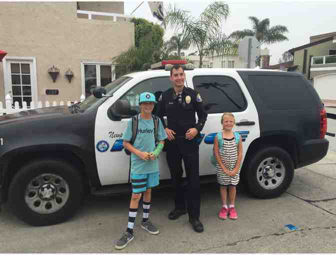 The day of the ride to school, your child and friend will be picked up at your home (Newport Beach addresses only), driven to school in a patrol car, stopping for a donut along the way. The officer will walk the certificate bearer to class, and if time allows, will stop in the room for the first 5 minutes of school to talk with the class.