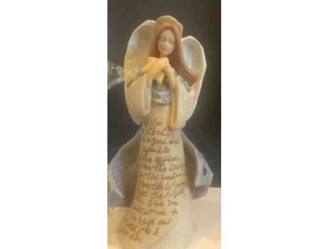 This beautiful angel figurine stands approx. 9" tall. On the body of the angel is a prayer for a Police Officer. It reads: Help me Lord to be a good and capable Police Officer. Give me the courage to face the unknown. Give me the wisdom to choose the right path. Give me the dedication to do the best and truest job I can do.
