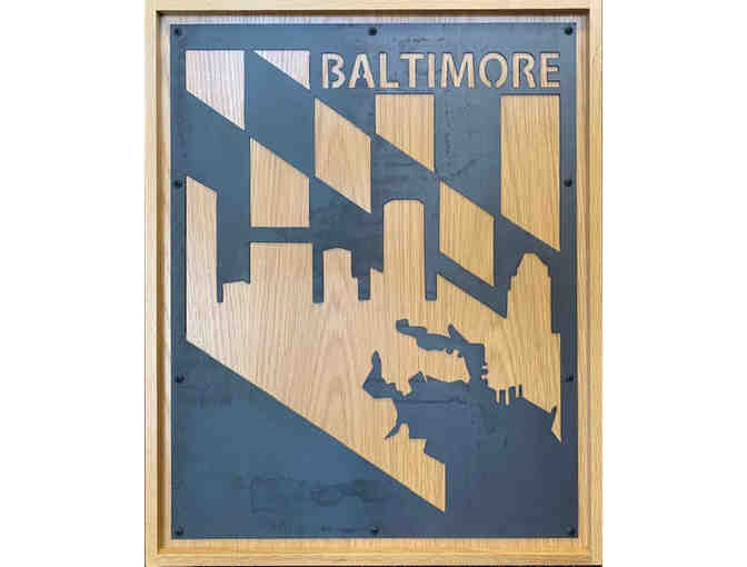 This is a really fun and unique way to display your love of Baltimore. An art piece that combines the city skyline, map of the harbor, and flag into a metal cutout framed by reclaimed pallet lumber. Truly a piece of Baltimore Art.