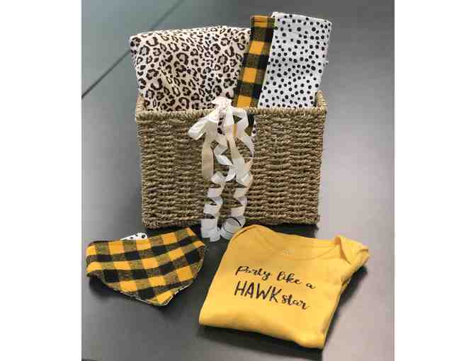 This cozy baby basket is perfect for any future Hawkeye! It includes one Party like a Hawk Star onesie, one yellow and black plaid bib, one yellow and black plaid cloth, and one soft and snuggly leopard print blanket.