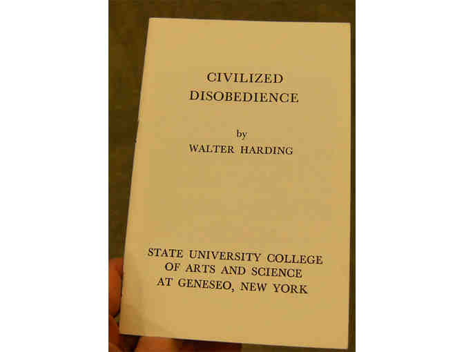 16-page pamphlet. "Civilized Disobedience" convocation speech given by Walter Harding at SUNY Geneseo, Geneseo, New York, in 1968. Pamphlet includes the text of the invocation presented by Rev. David Carter. A fresh copy of this essay, written in reaction to what was happening in the country at the time.