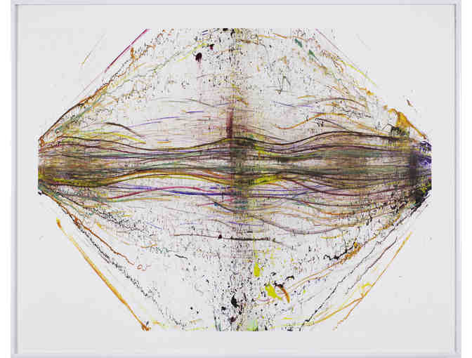 "Created by coating an elastic band with paint, drawing it back like a bowstring, and releasing it. It oscillates parallel to the surface, tracing and mapping an audible sine wave."