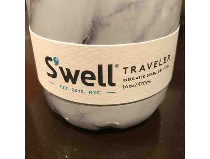 S'well Traveler. Insulated Stainless Steel. 16 oz. Keeps cold beverages very cold and hot ones hot for a good long time. Plus, it's stylin', and has a wide mouth, which is comfortable to drink from.