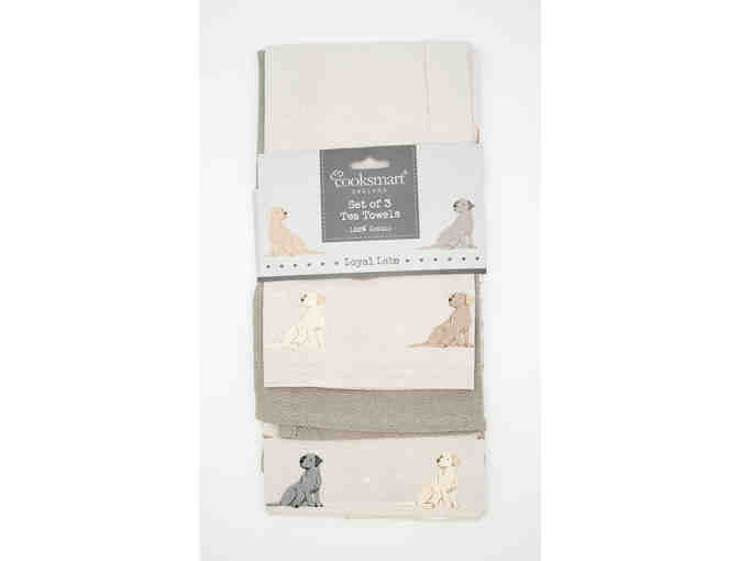 Show off your loyalty to your favorite breed with these 100% cotton, Labrador retriever printed tea towels! Set on an off-white background with a subtle blue hue, the first towel in the set contains sketched images of 4 seated Labrador Retrievers in charcoal, white, and light grey running along the bottom edge of the towel. Just above the middle 2 dogs there is a circular grey patch sewn onto the towel that contains the face of a white Labrador retriever. The message "Loyal Labs" with tiny hearts on either side of it appears in grey on the top and bottom of the patch, and the message "est. 1973" is written on either side of the dog's face. The second towel in the set contains only a thin, pastel grey and white chevron pattern, while the third towel in the set features alternating sketched images of tiny white hearts and seated Labrador Retrievers in charcoal, white, and light grey, all set against a light grey background. All 3 towels measure 45cm wide X 65cm long.