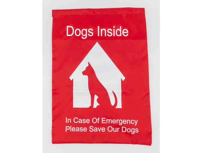 With this emergency "Dogs Inside" house flag, you can leave your pups at home with ease. Intended to be displayed outside of your home, this bright red flag will signal to neighbors in the case of an emergency that your dogs are inside the house. Printed on the top of the flag in white lettering is the message "Dogs Inside." Below that is an image of a white dog house with the side profile of a German Shepherd sitting inside, and below the image is another message that reads "In Case Of Emergency Please Save Our Dogs."