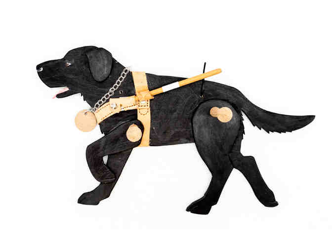Brighten up your mud room with a handmade wooden leash rack in the shape of a Seeing Eye® dog. This Black Lab dog leash and harness rack is jigsaw cut from birch plywood, hand painted and fitted out with two 3” oak shaker pegs. The dog proudly wears the Seeing Eye's harness in leather with a wooden handle. The rack will hold leashes or harnesses and the harness handle can be used to hold keys. The dog's head is side view, open mouth and features two ply sculpted ears. His/her near legs are two ply, made to look like the dog is walking. The dog wears a chain collar which has a wooden tag attached to it ready for you to personalize with your own dog’s name. This rack is 18" long x 10" tall and mounting hardware is included to easily mount to a wall.
