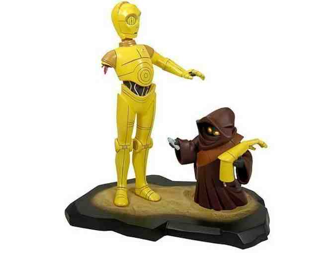 "You wouldn't hurt an unarmed droid, would you?" This colorful Star Wars maquette presents a fussy, flustered C-3PO in a scene inspired by the Star Wars films and the style of the Clone Wars animated series. A short and mischievous Jawa wearing a brown cloak has "disarmed" C-3PO and is holding on to the missing limb, probably demanding a ransom. To the left of the Jawa stands the yellow C-3PO, who is holding his left arm out towards the Jawa holding his missing right arm. The characters stand on a brown and tan irregularly-shaped platform. Standing 8 1/2 inches tall, this especially enjoyable collectible includes a certificate of authenticity and features a distinctive look and feel your collection can't be without. "Arm" your desk or shelf with this today!