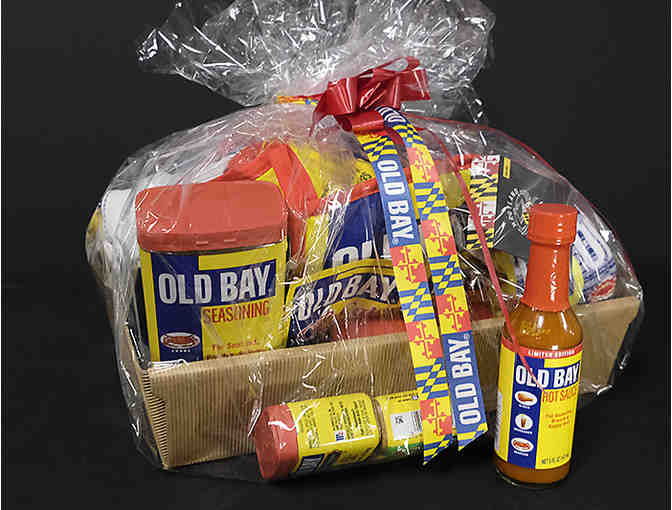 The perfect Baltimore gift! A basket of Old Bay items that includes spices and seasonings, beach towel, kitchen towel, crew socks, and more. And also--the coveted 5 oz bottle, Limited Edition, Old Bay Hot Sauce!