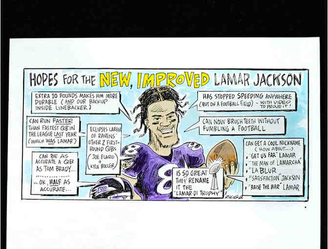 This cartoon of Lamar Jackson from Press Box --still our hero with unanimous pick for NFL 2020 MVP. See you next year! The cartoon is on paper and measures 4-1/2" X 10".