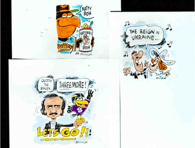 Baltimore's favorite Natty Boh, from the Baltimore Sun front page, (3-1/2" x 2- 1/2", Toon Trivia's Ukraine toon (4" x 3-1/2"), and a Facebook Toon during the Ravens spectacular run (5" x 4-1/2"). Thanks for the memories, Ravens!