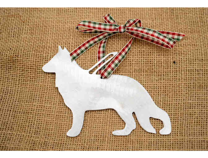 Reporting for duty! This polished aluminum metal German shepherd is in a harness, ready for work. The dog profile tail to nose is 5½ inches wide and 4½ inches tall. There is a detachable red, white, and green plaid ribbon, making the ornament suitable for hanging on a Christmas tree or anywhere in your home.