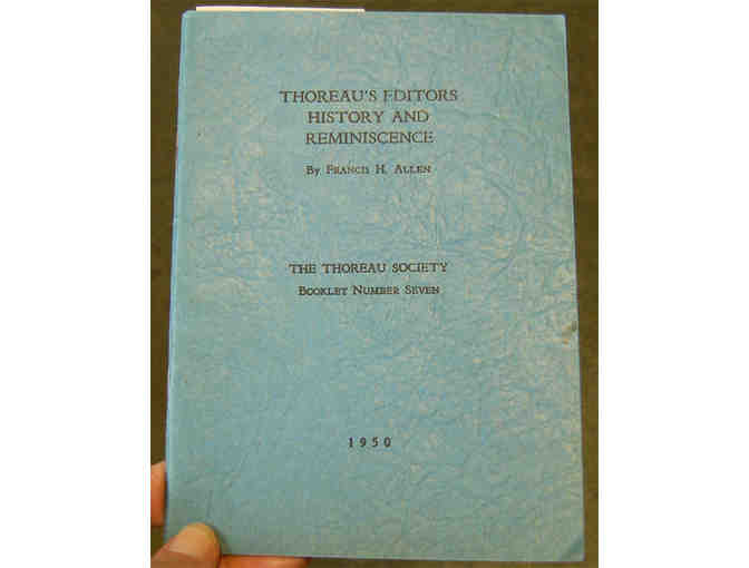 Thoreau's Editors: History and Reminiscence, by Francis H. Allen. The Thoreau Society Booklet Number Seven. 1950.  5 x 7 inches booklet with blue paper cover. This copy is lightly used and is INSCRIBED BY THE AUTHOR on the half title page. Allen addresses the work of Sophia Thoreau, H. G. O. Blake, and Frank Sanborn, among others, as the individuals who edited Thoreau's posthumous volumes. A nice essay of publication history.