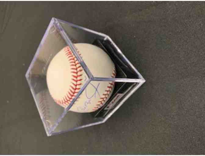 Rawlings Official Game Ball 01 from the Authentic Collection autographed by Cal Ripken in a plastic, square display case.