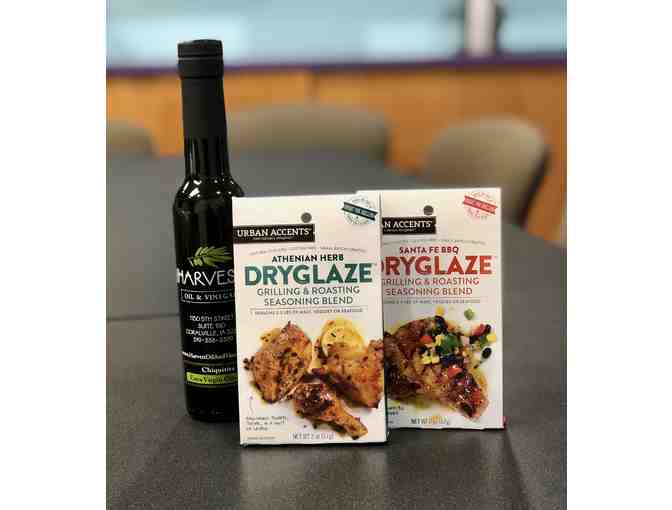 200 ml bottle of UP Olive Oil and two dryglaze seasoning blends from Harvest Oil & Vinegar.