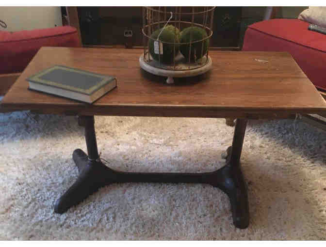 This unique coffee table is made from the base of an antique school desk and paired with a beautiful wooden surface. Wouldn't it make a wonderful addition to your home's decor?