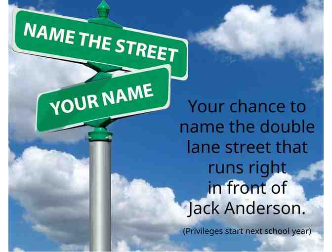 This is your chance to name the double-lane street that passes right in front of Jack Anderson! This premium signage is visible from Shutes lane and by hundreds of car riders and their parents every morning and every afternoon!! How fun it would be to have your name on the street? Or, what a great marketing opportunity for just the right business!