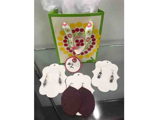 2.5" Burgandy textured leather feathered earrings, navy and silver earrings and blue, orange and silver earrings.