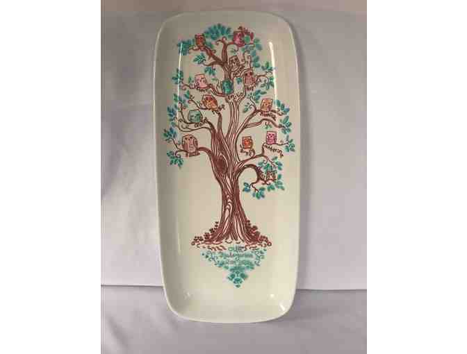 Each student pressed their thumbprint onto the rectangular platter with teal acrylic paint. An owl was created with the thumbprint as the center of the owl. All of the student's names are on the platter. This keepsake will be a conversation piece for years to come.