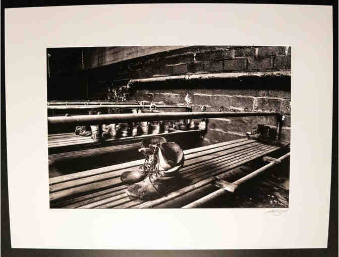 Photographer Michael Sandy captures meaning and art in this black and white detailed image of well-worn leather work boots reminiscent of those worn in the early 20th century in an industrial setting. The boots sitting in the forefront almost express a personality of their owner in its slouched, tired nature - alone, yet surrounded by other nearby work boots. The wooden platform upon which they rest, the smooth metal poles above, and the worn brick wall behind bring an amazing amount of texture to this photo. The photo itself is signed and measures 17.5” x 12” with the total print including mat at 18”x24”.