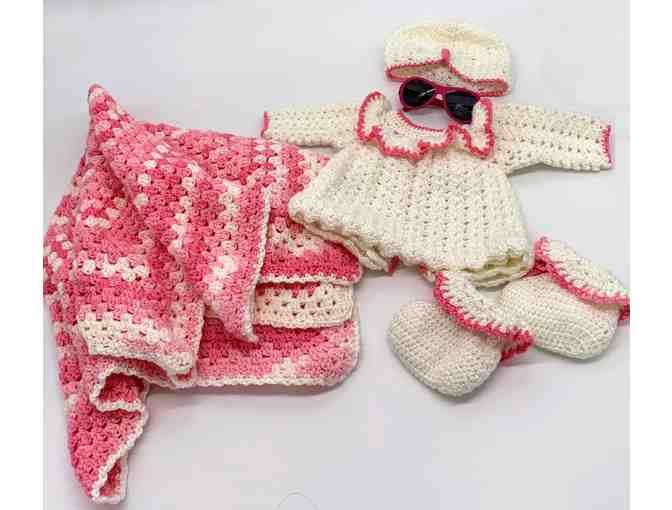 Handmade Crocheted Layette Set in Pink & White with Pink Babiator Sunglasses