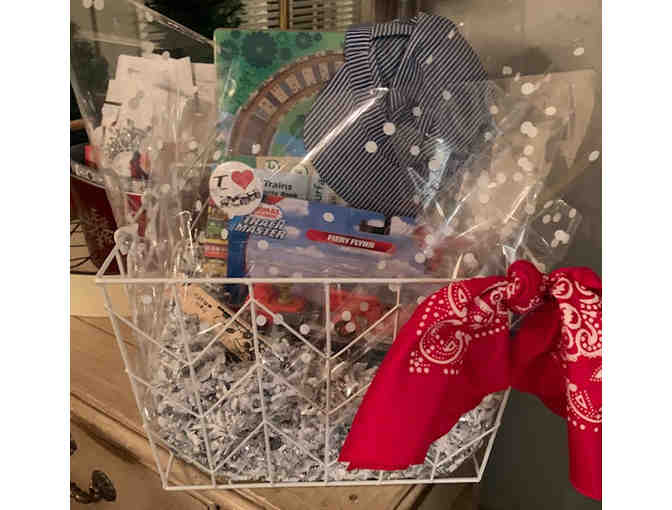 Basket includes: Melissa & Doug travel train set, conductor’s hat and bandana, Thomas and Friends fire truck train, train whistle, train children’s books and stuffed conductor friend.