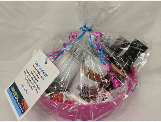 Jack's Lawn & Pool has your grilling needs covered with this amazing gift basket. In it you will find Kosmos Q BBQ Sauce, Sweet Smoke, Honey Jalapeno, Simply Marvelous Spicy Apple, Astro Pigs Space Dust BBQ Rub & a 20 oz Yeti Tumbler.