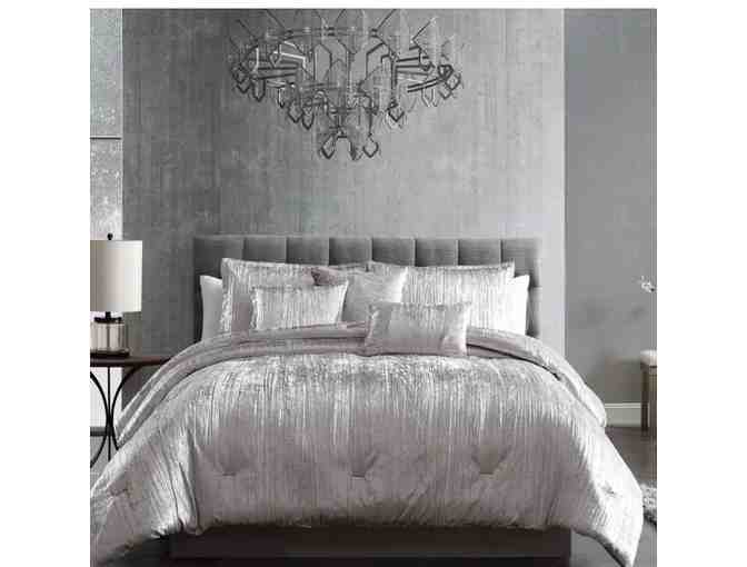 This comforter set of coordinating pieces of pure luxurious glam. This big bold look of crinkle silver velvet, quilted shams and matching decorative pillows says ”go big or go home”. This versatile styling makes Taos the perfect choice for any décor from modern to traditional that's simple and elegant. Everything included for an instant transformation.
