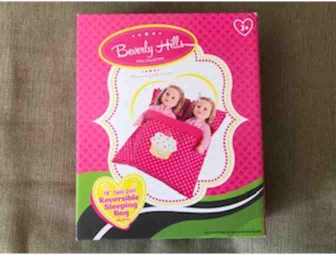 Beverly Hills Doll Collection reversible sleeping bag fits 18" twin dolls. Set inlcudes 1 double sleeping bag with 2 pillows that attach to the sleeping bag. It's a perfect addition to your American Doll collection!