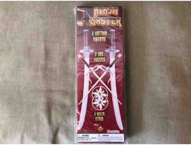 This kit has all the Ninja weapons and Gear you will need for role play and dress up! This 6 piece Ninja kit is perfect for costumes or pretend play. It includes 2 toy Ninja Swords, 2 toy Ninja throwing stars, and 2 toy Ninja knives. Each plastic piece is safe for kids. Reccomended age is 8 and up.