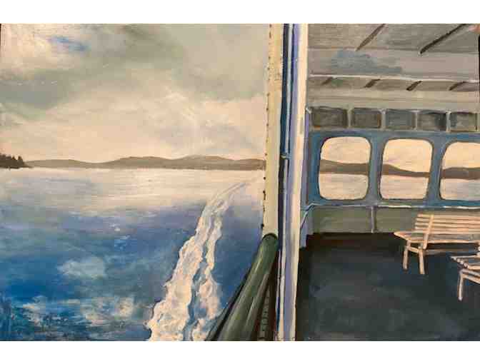 I pulled this piece from my collection of works at RiverSea Gallery in Astoria for this auction. I am enamored by the ferry boats, and I took a lot of photos when we went to visit Kimora at camp; there is something so magical about traveling this way. I always say that living in the northwest is just like living in a moving painting.