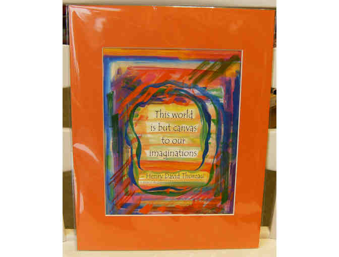 "This World is but Canvas to Our Imaginations." The Thoreau quote from A Week on the Concord and Merrimack Rivers has been made into a colorful poster by artist Raphaella Vaisseau. The poster itself measures 7.5 x 9.5 inches, and the orange mat makes the finished piece 11 x 14 inches. Sure to brighten any room!
