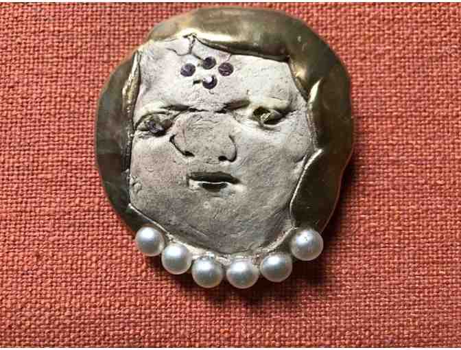 Wolf, the creator of these one-of-a-kind brooches, is a Renaissance woman whose love and creativity is reflected in all of her work, no matter what the medium. This "Pearl Smash Mouth" pin is porcelain with 14K gold, copper lustre, Swarovski crystals, and pearls--it measures approximately 4" x 4"--one of her larger pieces. Wolf has been crafting jewelry continuously since 1976 and has made over 80,000 one-of-a-kind pieces!