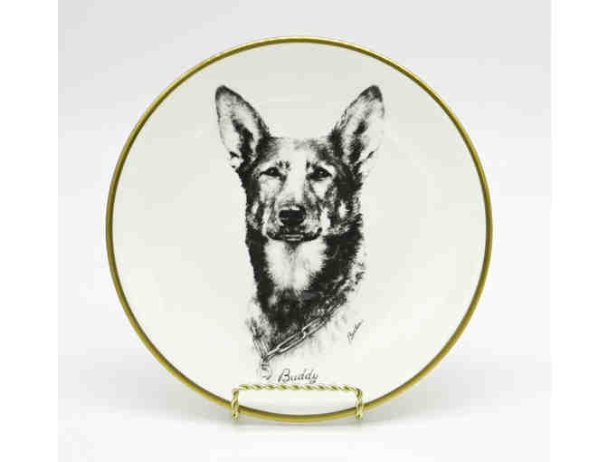 Take this incredible chance to grace your home with a touching piece of history! A beautifully, touching black and white portrait of Buddy, the faithful first seeing eye dog to Morris Frank, founder of The Seeing Eye® in Morristown, graces the front of this white, gold-rimmed Boehm porcelain decorative plate. Boehm porcelain was founded by husband and wife, Helen and Edward Boehm, and has graced both museums and the homes of royalty and heads of state for six decades. The names of both “Buddy” and “Boehm” are elegantly scripted in the front beneath Buddy’s dignified portrait. The back of the plate provides a touching summary of Buddy and his significant role paving the way to provide so many the ability to live fulfilling lives with independence, dignity and self-confidence. The workmanship and artistry of this 8” diameter plate is unparalleled and steeped in meaning.