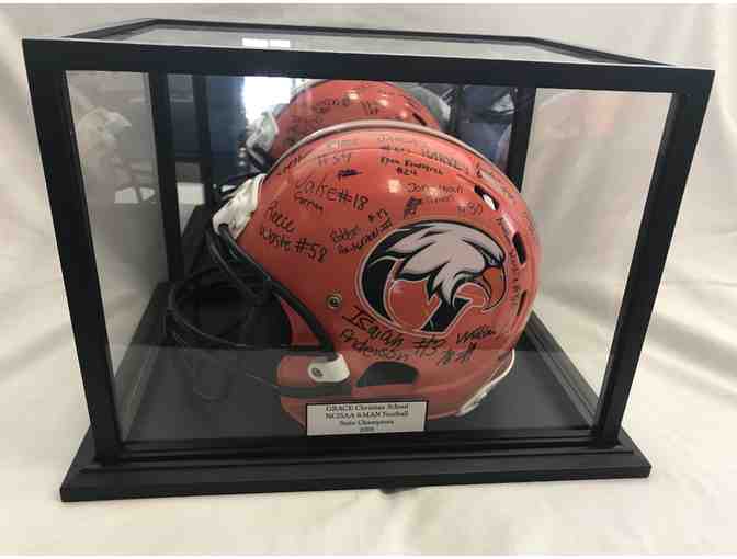 A signed helmet by the 2019 NCISAA 8-Man Football State Champions the GRACE Eagles in a beautiful black glass and mirrored display case.