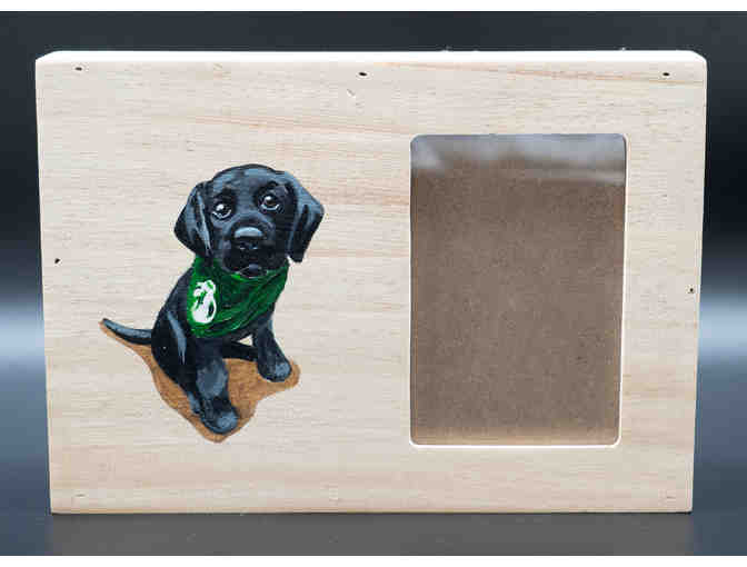 If you’re a lab-lover, this hand-painted wooden picture frame is just begging to be displayed in your home. The left side of this tan, wooden frame features a hand-painted photo of a black Labrador retriever Seeing Eye puppy. The puppy is sitting and looking directly up at the camera with wide eyes while wearing a green Seeing Eye puppy scarf. The right side of the frame features a rectangular glass slot for you to display your own photo. The frame will fit a photo that measures 4 & ¾ inches tall and 3 inches wide, and the frame itself measures 6 & ½ inches tall and 9 & ½ inches wide.