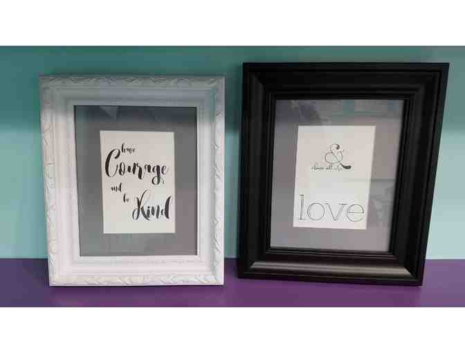 Two whimsical signs to enhance any decor! White framed "Have Courage and Be Kind" sign is approximately 11" x 13". Black framed "Above All Else Love" sign is approximately 11" x 12".