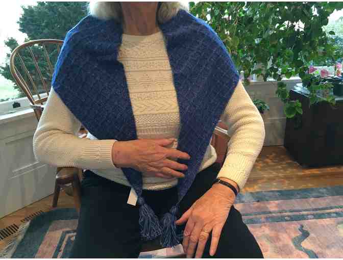 Triangular, warm blue shawl. Beautiful blue, cotton/acrylic yarn with intriguing knit pattern. Hand wash. 56" wide x 39" tall with a 65" hypotenuse. Never worn; price tag from Talbots attached.