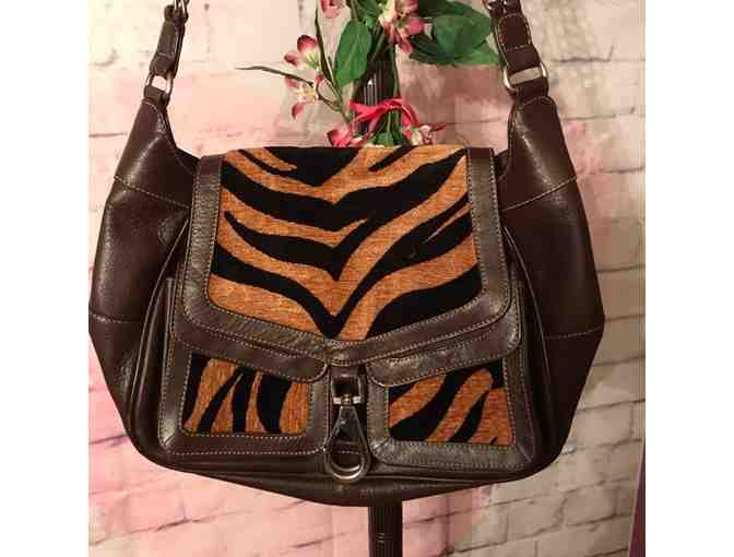 Brown leather Sophia VISCONTI handbag has 2 Front Snap Pockets And Back Zipper Pocket. Inside Has A Zipper Pocket And 2 Slip Pockets.