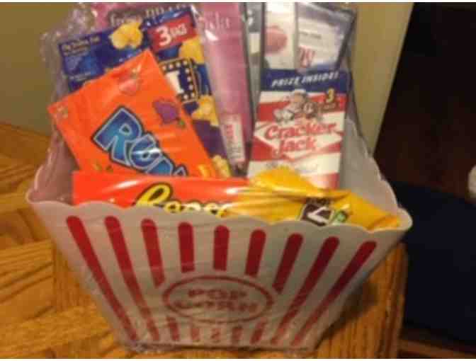 Basket includes popcorn and candy to include everything for a great movie night!