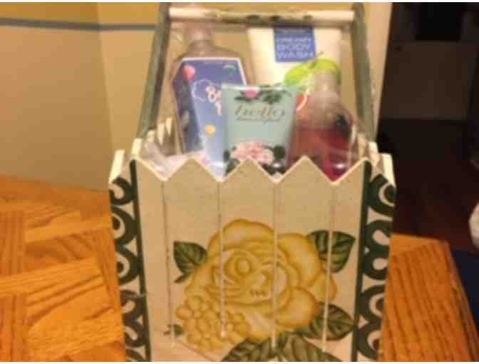Basket of goodies from Bath and Body Works in a wooden painted basket. Includes: