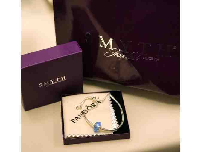 A beautiful sterling silver Pandora adjustable bracelet with one blue charm.